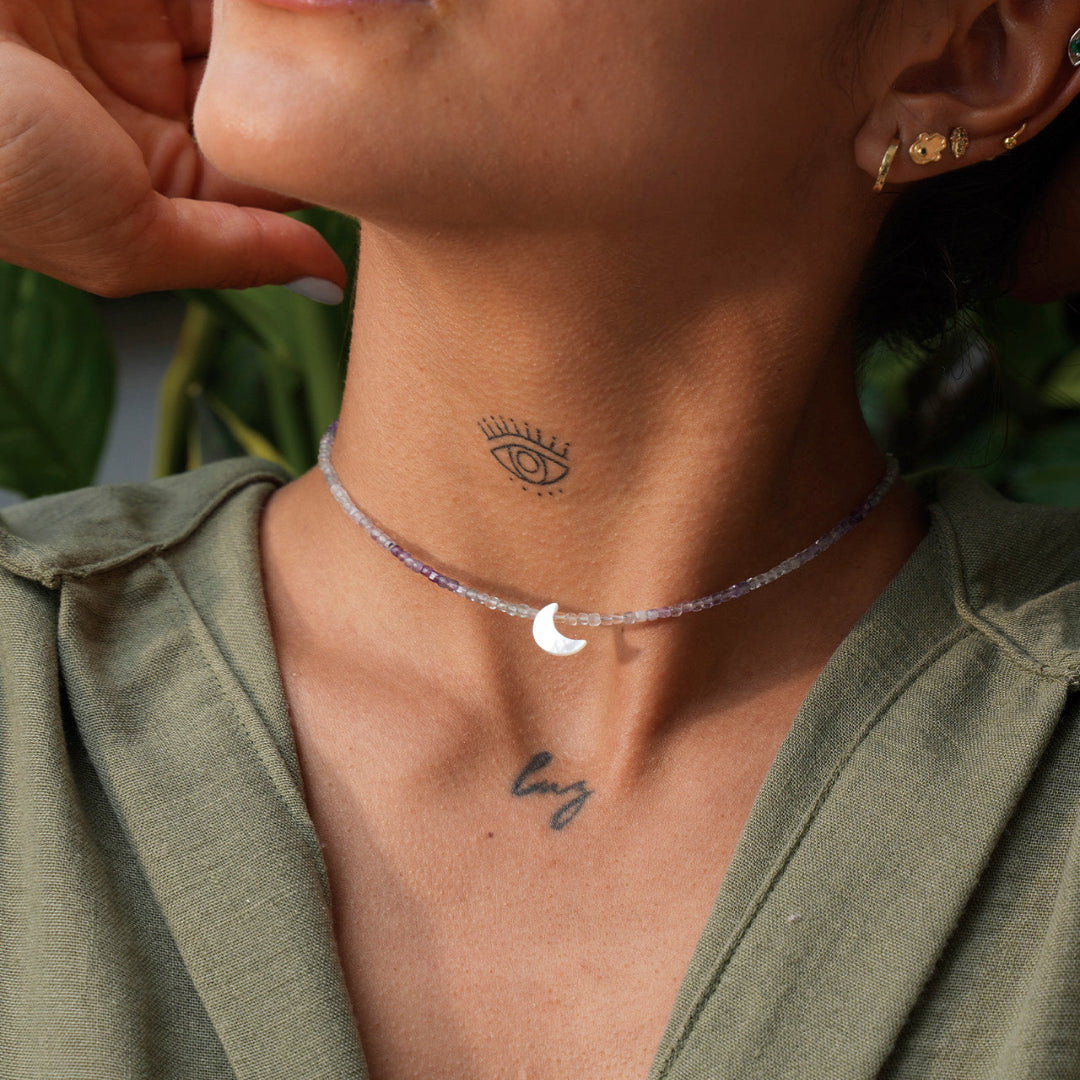 Descubre tu balance y equilibrio interior con nuestro talisman de choker que incluyen cristales naturales de granate para protección, apatita azul para calma y fluorita para balance. Accesorios holísticos que te ayudarán a potenciar tu bienestar.